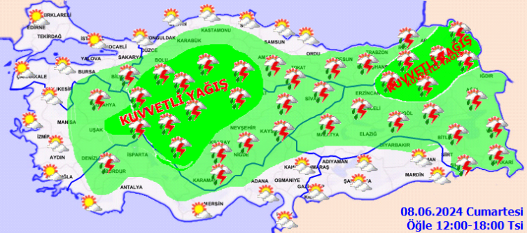 Yağışların, Ankara, Eskişehir, Çankırı, Kırıkkale, Kırşehir, Yozgat, Afyonkarahisar, Konya, Çorum, Bolu’nun güney ve doğusu, Karabük'ün güney kesimleri, Erzurum, Kars, Ardahan, Ağrı ve Bayburt çevreleri ile Rize ve Artvin illerinin iç kesimlerinde yerel olarak kuvvetli olması bekleniyor. Bu bölgelerde yaşayan vatandaşların sel, su baskını, yıldırım, yerel dolu yağışı, ani kuvvetli rüzgar ve kısa süreli fırtına gibi olumsuzluklara karşı dikkatli ve tedbirli olmaları gerekiyor.
