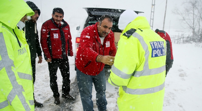 Türk Kızılayı ekipleri, D-100 Karayolu'nun Bolu Dağı kesiminde ilerlemekte güçlük çeken ve zincir takan sürücülerin yardımına koştu.