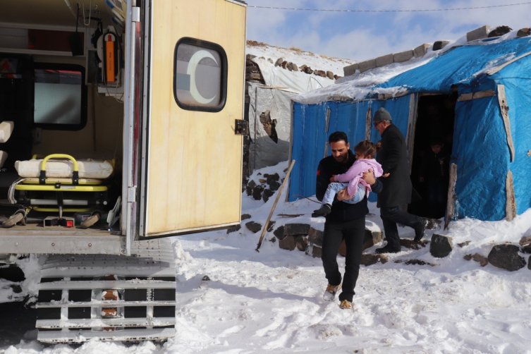 Mezra yolunun kar ve tipi nedeniyle ulaşıma kapalı olması nedeniyle çocuklarını hastaneye götüremeyen aile, yüksek ateş ve öksürük şikayetiyle 112 Acil Çağrı Merkezi’ni arayarak yardım istedi.