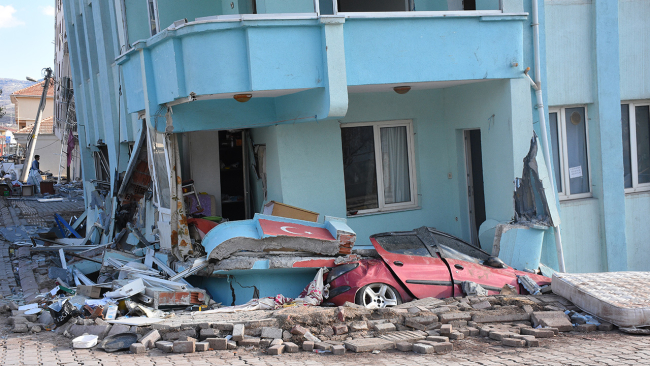 "Bazı binalar sanki 3-4 metre öne gelmiş gibi. Zeminin yumuşak olduğu yere doğru sıvılaşma esnasında binalarda lokal anlamda ötelenmeler meydana gelmiş. Binalar, park edilen araçların üzerine oturmuş. Bu gördüğümüz daha çok balkon altındaki çıkma kısmında meydana gelen oturmadır. Yani şu an gördüğünüz görüntüde zemin kat tamamen çökmüş ve birinci kat, zemin kat pozisyonuna geçmiş durumda. Birinci kat ise park halindeki araçların üzerine oturmuş."