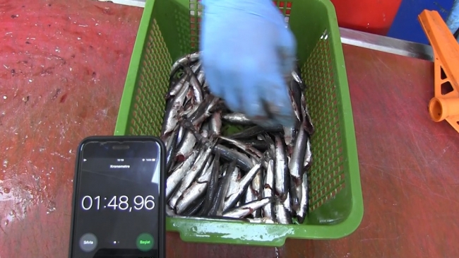 Tekirdağ Çerkezköy'de balıkçılık yapan Tugay Ayaz, işe koyuldu. Genç balıkçı, 1 kilo hamsiyi 1 dakika 48 saniyede temizledi.