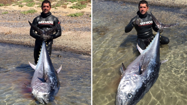 Çanakkale'nin Bozcaada ilçesi açıklarında yaklaşık 20 metre derine dalan bir kişi, zıpkınla 2 metre uzunluğunda ve 130 kilo ağırlığında orkinos avladı.