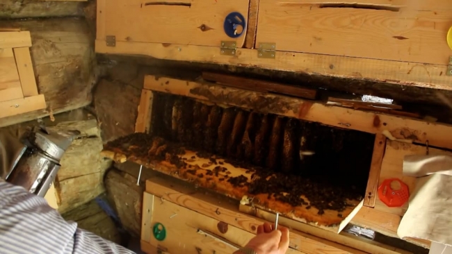Hüseyin Mahsül, ''Bu bölgede olmayan bir kovan tipidir. Bu kovan kalın çam ağaçlarından yapılan bir kovan. İçinde doğal kara kovan balı üretiyoruz'' diyerek kovanın özelliklerini anlattı.