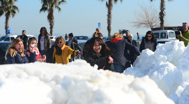 Belediye ekiplerince Geyikbayırı ve Saklıkent bölgelerinden 6 kamyona yüklenen kar, Konyaaltı Sahilindeki Kent Meydanı'na döküldü. Öğle saatlerinde 17 dereceyi bulan sıcak havanın tadını çıkarmak için deniz kenarına gelen vatandaşlar, kar tepeciğiyle karşılaşınca şaşkınlık yaşadı. Kar topu savaşı yapan vatandaşlar, eğlenceli dakikalar geçirdi.