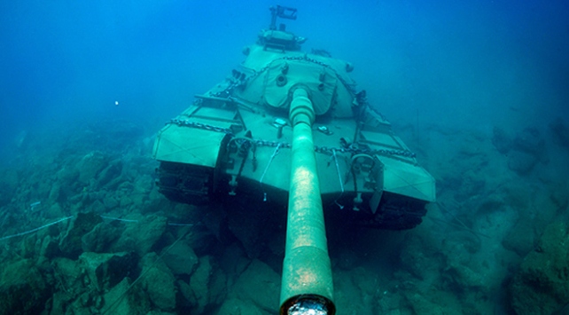 Türk Silahlı Kuvvetlerine (TSK) ait 45 tonluk 1960 model tank, Kaş Limanı'nda 5 metre derinliğe batırıldı.