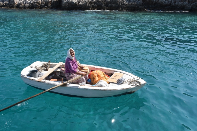 [Fotoğraf: DHA]82 yaşındaki kadın, yüzme molası veren yatlar arasında gezerek satış yapıyor.