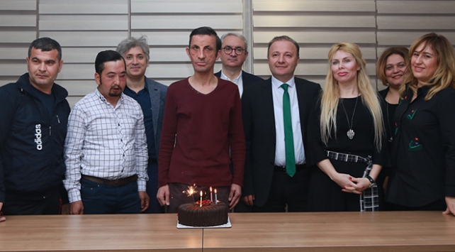 Türkiye'de ilk yüz naklinin yapıldığı Uğur Acar, yeni hayatına başlamasının beşinci yılını, ameliyatı gerçekleştiren doktorlarla pasta keserek kutladı.
