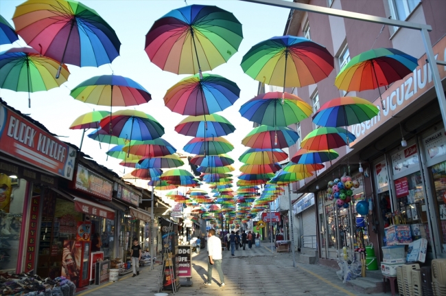 Belediye tarafından proje kapsamında kent merkezindeki İşletme ve Terziler caddelerine farklı renklerde yüzlerce şemsiye yerleştirildi.