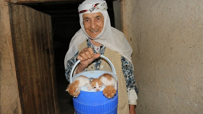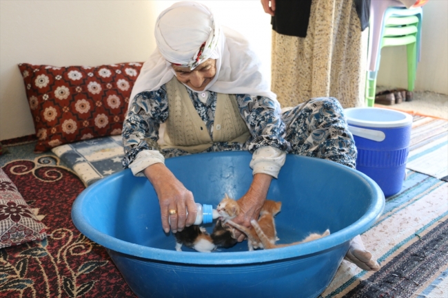 Adıyaman Kahta’da yaşayan 96 yaşındaki Zeynep Duran, anneleri ölen dört kedi yavrusunu biberonla besliyor.