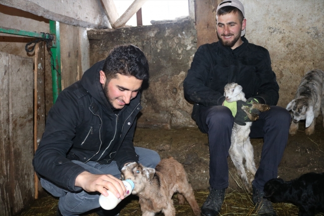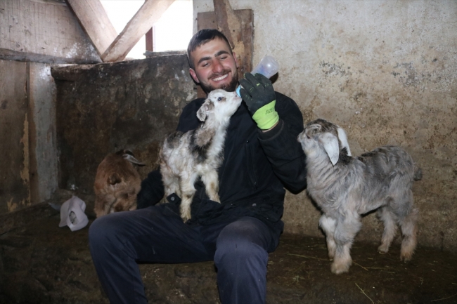 Kars Arpaçay'da yaşayan Mikail Ayaz, annesi ölen Poyraz'ı ve üçüz doğuran bir keçilerinin yavrularını biberonla beslediklerini söyledi.
