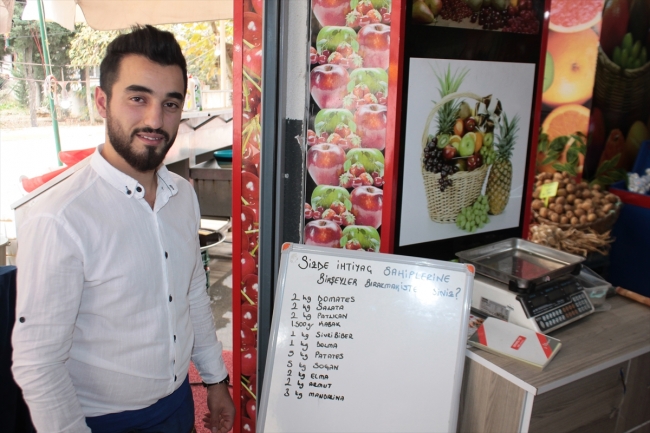 Manavdaki "Siz de ihtiyaç sahiplerine bir şeyler bırakmak ister misiniz?" yazılı tahtada ihtiyaç sahiplerine liste halinde bırakılan ürünler yer alırken, ihtiyaç sahipleri istedikleri meyve ve sebzeyi ücretsiz alabiliyor, talep edenlerin evlerine de ihtiyaçları ücretsiz ulaştırılıyor.