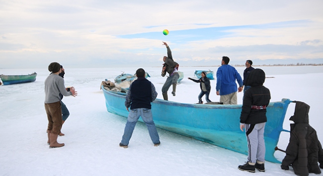 Donan göl üzerinde futbol ve voleybol oynayarak vakit geçirdiklerini ifade eden Yılmaz, "Buz voleybolu oynamak için bir tekneyi ortada direk yaptık. Köydeki arkadaşlarla iki grup halinde voleybol oynadık. Bundan çok keyif alıyoruz." dedi.
