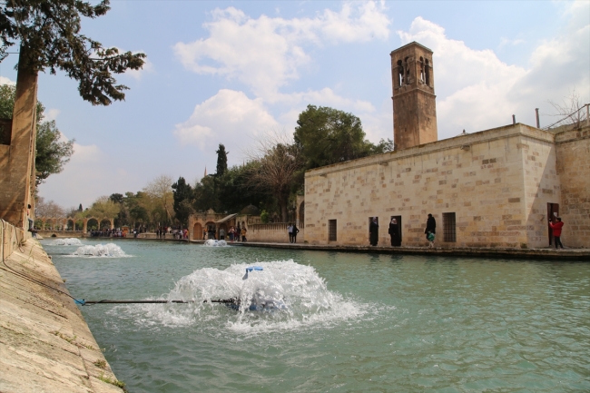 Şanlıurfa'da, Hazreti İbrahim'in doğup büyüdüğü ve dönemin hükümdarı Nemrut tarafından ateşe atıldığı yer olarak rivayet edilen tarihi Balıklıgöl, ilkbahar mevsiminde ziyaretçilere görsel şölen sunuyor.