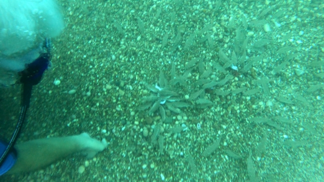 Balon balıklarının, verilen sert kabuklu midyeleri birkaç saniye içinde yok ettiği görüldü. Görüntüleri çeken Prof. Dr. Mehmet Gökoğlu, balon balıklarının çoğaldığını söyledi.