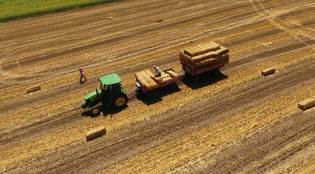 Buğday tarlalarındaki hasadın ardından geriye kalan saplar, hayvan yemi olarak kullanılmak üzere her biri 25 kilogram gelen balyalar haline getiriliyor.