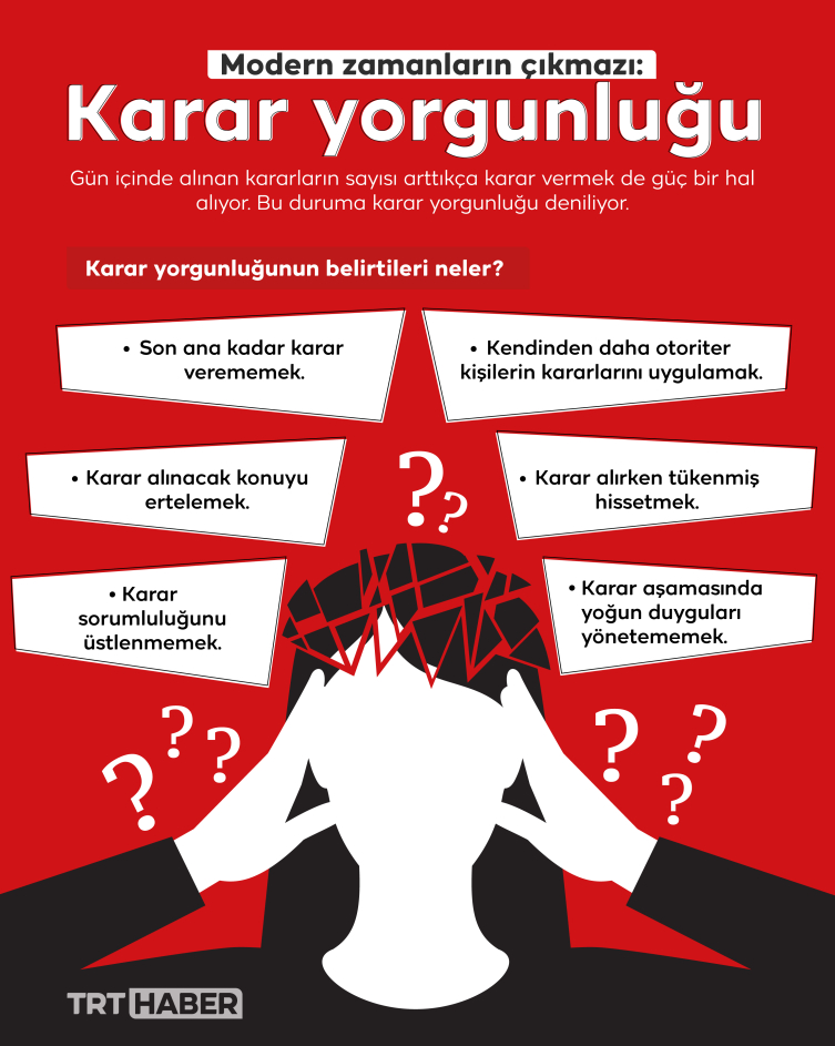“Karar yorgunluğu kendini bazen karar vermesi gereken yerlerde karar vermeme, erteleme, sorumluluğu üstlenmeme, kendinden daha otoriter kişilerin kararlarını uygulama, tükenmiş hissetme, yoğun duyguları düzenleyememe gibi belirtiler görülebilir.”