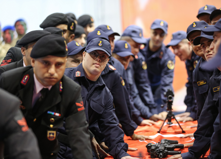 Aileleriyle gelen 37 zihinsel ve bedensel engelli genç, jandarma üniforması giydi. Spor salonunda hazırlıklarını tamamlayan gençler, saygı duruşunda bulunulması ve İstiklal Marşı'nın okunmasının ardından ellerini Türk bayrağı ve silahların üzerine koyup ant içti.