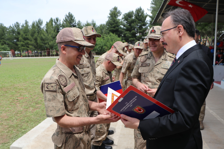 Jandarma üniforması giyen gençler, saygı duruşunda bulunulması ve İstiklal Marşı'nın okunmasının ardından ellerini Türk bayrağı ve silahların üzerine koyup ant içti.