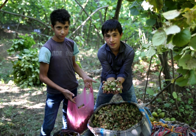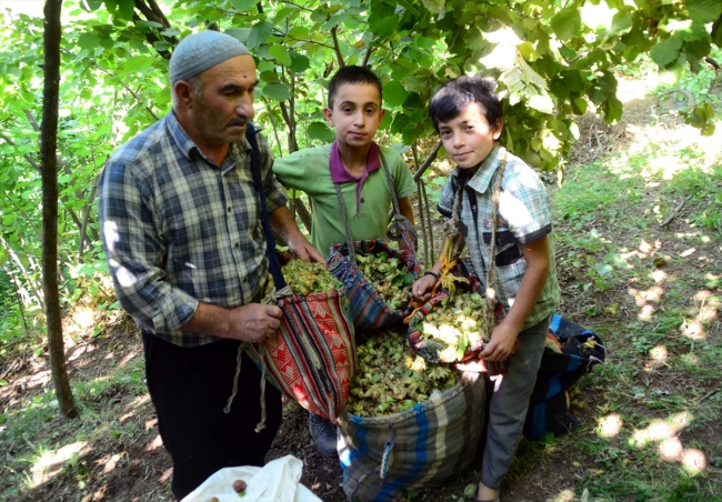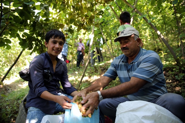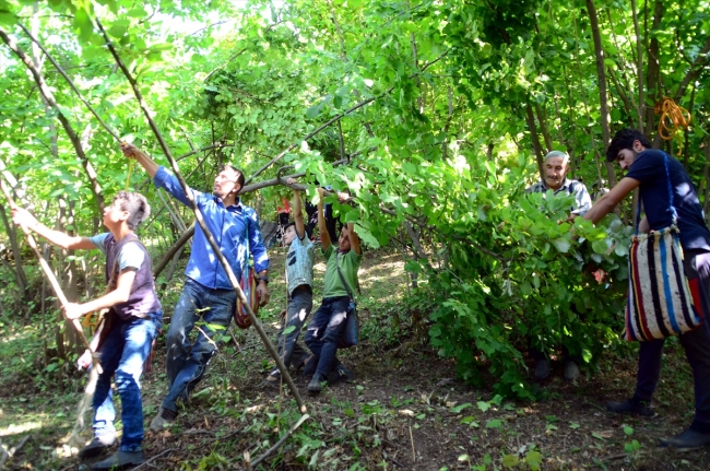 Coğrafi şartlar nedeniyle engebeli arazi içerisinde zor şartlarda yetiştirilen fındığın hasat döneminde köylüler, ağaçları yaptıkları çengellerle yere çekerek topladıkları fındıkları büyük çuvallara dolduruyor.