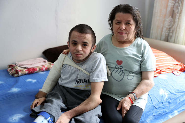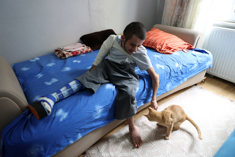 Hastalığı nedeniyle 27 kez ameliyat olan 22 yaşındaki Emre'yi annesi bir gün olsun yalnız bırakmadı. Emine Karaşin, evde düşüp sağ bacağı, kolu kırılan ve bu nedenle 4 yıldır yürüyemeyen oğlunun yanından ayrılmıyor.