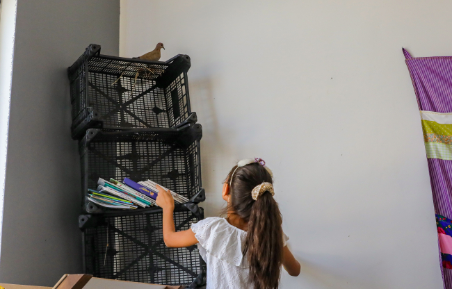 Demir, "Burada gördüğünüz malzemelerin tamamı normalde çöpe atılabilecekken biz bunlardan faydalanma yoluna gittik. Pet şişe, kasa, eskiyen sıra ve masa parçaları ve evde kullanılmayan kumaş parçalarından böyle bir kütüphane oluşturduk. Kütüphanemizin ilk misafiri kumru oldu. Kumru çocuklarla çok güzel bir uyum içerisinde. Yuva yaptı." ifadelerini kullandı.
