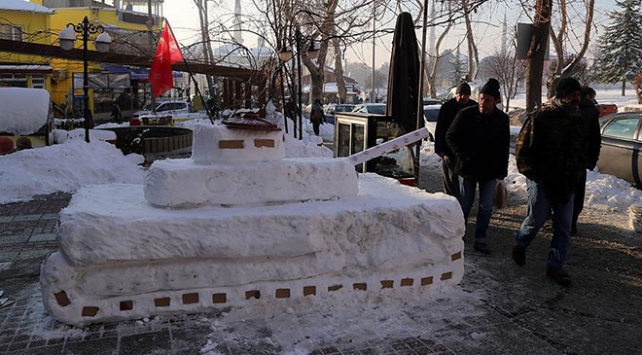 Tokat'ın Niksar ilçesinde yaşayan esnaflık yapan Yasir ve Şehit Sarıca kardeşler, çevredeki vatandaşların da yardımıyla topladıkları yaklaşık 4 ton kardan tank yaparak, üstüne Türk bayrağı astı.