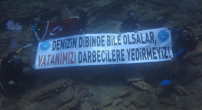 Denizin metrelerce altında, "Denizin dibinde bile olsalar vatanımızı darbecilere yedirmeyiz" yazılı pankart açan dalgıçlar, ardından "Darbecilere karşı Başkomutanın yanındayız" yazan ikinci bir döviz açtı.