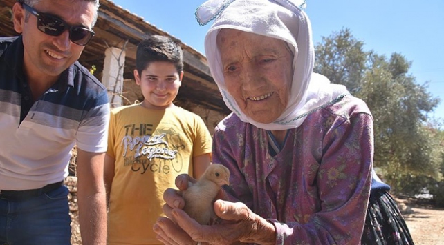 Ege Denizi'nde yaşanan 6,5 büyüklüğündeki depremde Bodrum ilçesinde oturduğu eski evi yıkılan ve çok sevdiği civcivleri yıkıntıların altında kalarak telef olan 87 yaşındaki Ayşe Küçükköse'ye, civciv ve tavuk hediye edildi.