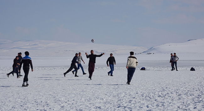 Köy sakinlerinden Erkan Kardoğan, yaptığı açıklamada, kış mevsimi boyunca donan gölde futbol oynayarak boş zamanlarını değerlendirdiklerini söyledi.