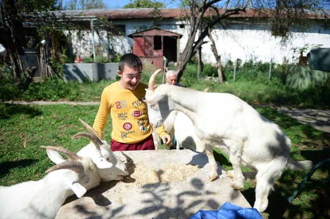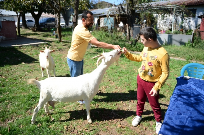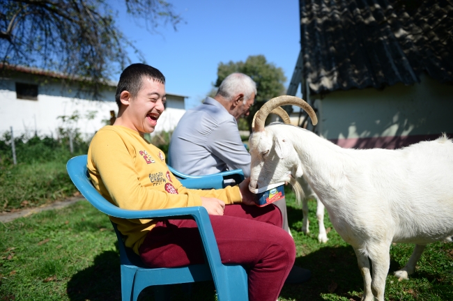 Sakarya'da hayvanlara karşı ilgisi ailesi tarafından fark edilen 12 yaşındaki down sendromlu Yasin Soyalp, dedesinin çiftliğinde keçilerle zaman geçirerek adeta terapi görüyor.