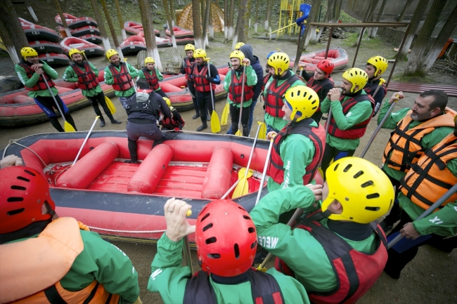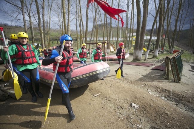 Daha sonra Tepe'nin rehberliğini yaptığı grup, özel kıyafetlerini giyerek Melen Çayı'nda sezonun ilk rafting turunu gerçekleştirdi.
