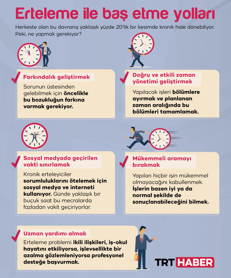 [Grafik: TRT Haber]"Bunun bir farkındalığının olması gerekiyor. Yaş, meslek fark etmeksizin, böyle bir problemi yaşadığını kişinin kabul etmesi gerekiyor. Sonra da buna sebebiyet veren, kişinin konsantrasyonunu bozan, ertelemeye yol açan etmenler tek tek not edilmeli. İşe başlarken ertelemeye sebep olan nedenler, nesneler ortadan kaldırılmalı.