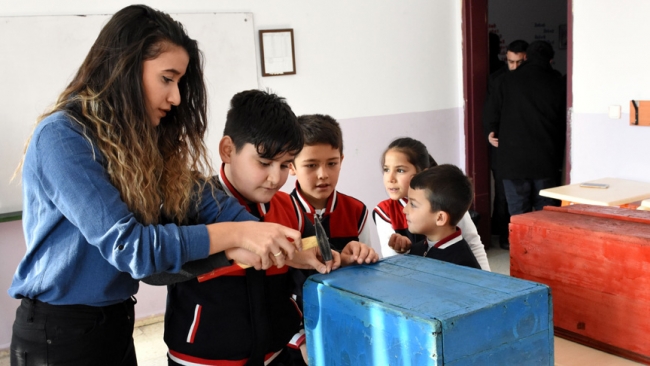 "Öğrencilerimiz, Yüksek Seçim Kuruluna ait 30-40 yıl öncesinden kalma, kullanılmayan çürümeye terk edilmiş seçim sandıklarından sokak hayvanlarına yuva yaptı. Sandıklara hayvanların girip çıkması için 'göz' açtılar. Güzelce boyadılar, yuva haline getirdiler, yerlerine yerleştirdiler. Soğuk kış günlerinde öğrencilerimiz sıcak bir dokunuş yapıyor. Proje başladı başlayalı kedilerimize ve diğer hayvanlara süt yetiştiremiyoruz. Bu yaşta bu yavrularımıza hayvan sevgisini kazandırdığımız takdirde ömür boyu bu sevginin gideceğine inanıyoruz."