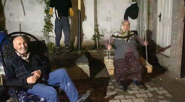İstanbul Sultanbeyli Battalgazi Mahallesinde yaşayan Aydın çifti, koronavirüs nedeniyle evde kalmaları sebebiyle canları sıkılınca evlerinin avlusuna bir salıncak kurdu.