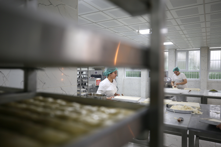 Gruplar halinde önce baklavanın hamurunu açan, daha sonra fıstık serimi, yağlama ve kesim yapan öğrenciler, baklavayı pişirdikten sonra siparişlere göre ayırıyor.
