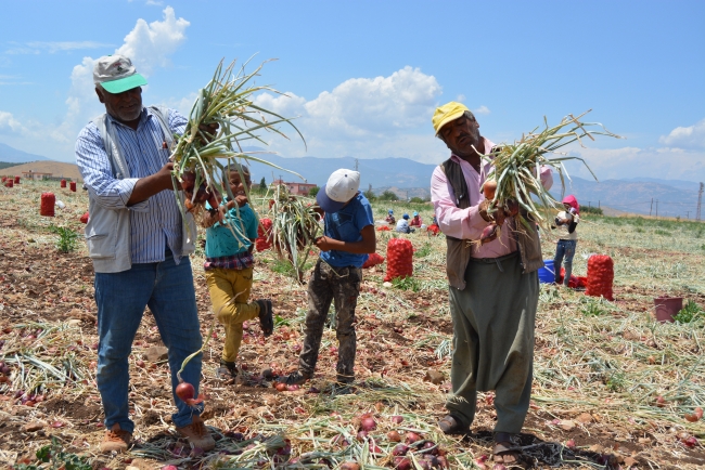 Sabah erken saatlerde tarlalarda söküme başlayan işçiler, belirli yerlerde topladıkları soğanı kök ve yeşil kısımlarından ayırıyor. Ardından file tipi çuvallara doldurulan soğanlar, tarlada satışa hazır hale getiriliyor.