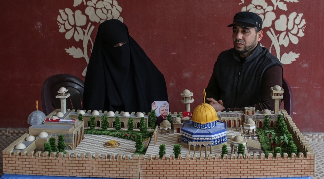 Ferhat, maketi aslına uygun yapmak için titiz bir çalışma yürüttüğünü vurgulayarak, "Kubbetu's-Sahra'yı altın renkli iple işledik. Kırmızı ve beyaz iplerle yaptığımız Türk bayrağı da makette yerini aldı." dedi.