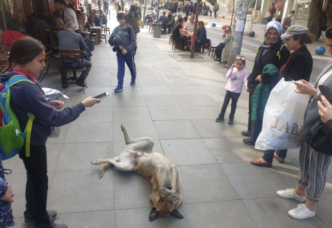 Bahariye caddesinde pozlar veren sokak köpeği, yoldan geçenler tarafından cep telefonlarıyla görüntülendi.