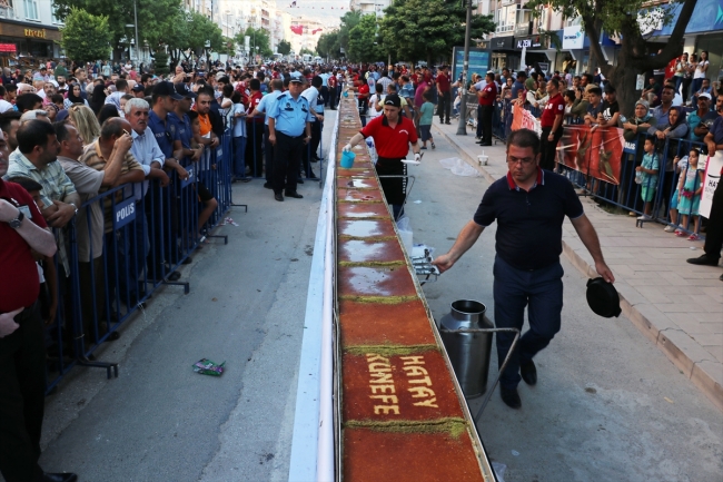 Künefe ustası Mustafa Yılmaz, 79 metre uzunluğundaki künefenin 10 kişiyle bir haftada hazırlandığını, yapımında 800 kilogram çiğ kadayıf, 600 kilogram peynir, 300 kilogram tereyağı, 300 kilogram şeker ve 30 kilogram Antep fıstığı kullanıldığını söyledi.