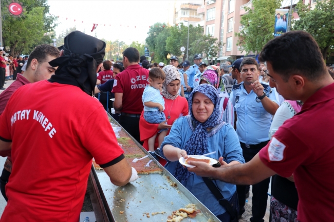 Hatay Büyükşehir Belediye Başkanı Lütfü Savaş, Atatürk Caddesi'ndeki etkinlikte, Hatay'ın ana vatana katılışının yıl dönümünde geleneksel olarak vatandaşlara künefe dağıttıklarını söyledi.