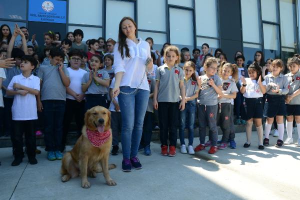 Okula, barınağa terk edilmiş Golden cinsi bir köpek ve kulübe verildi. Bakımı okul tarafından yapılacak köpeğe ilgi gösteren çocuklar, beslemek için sıraya girdi.
