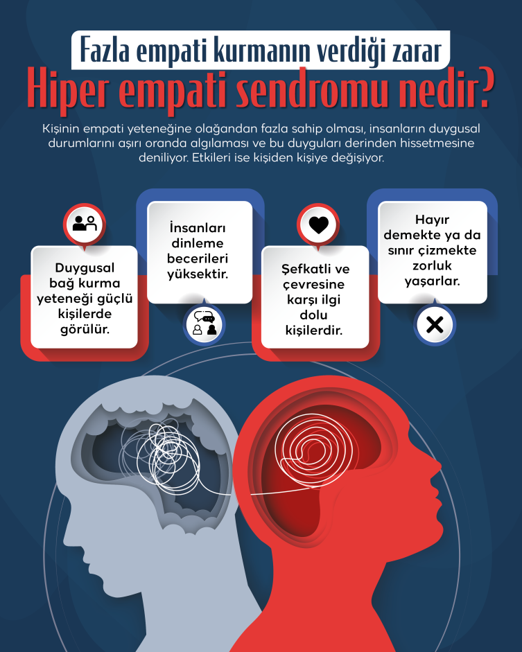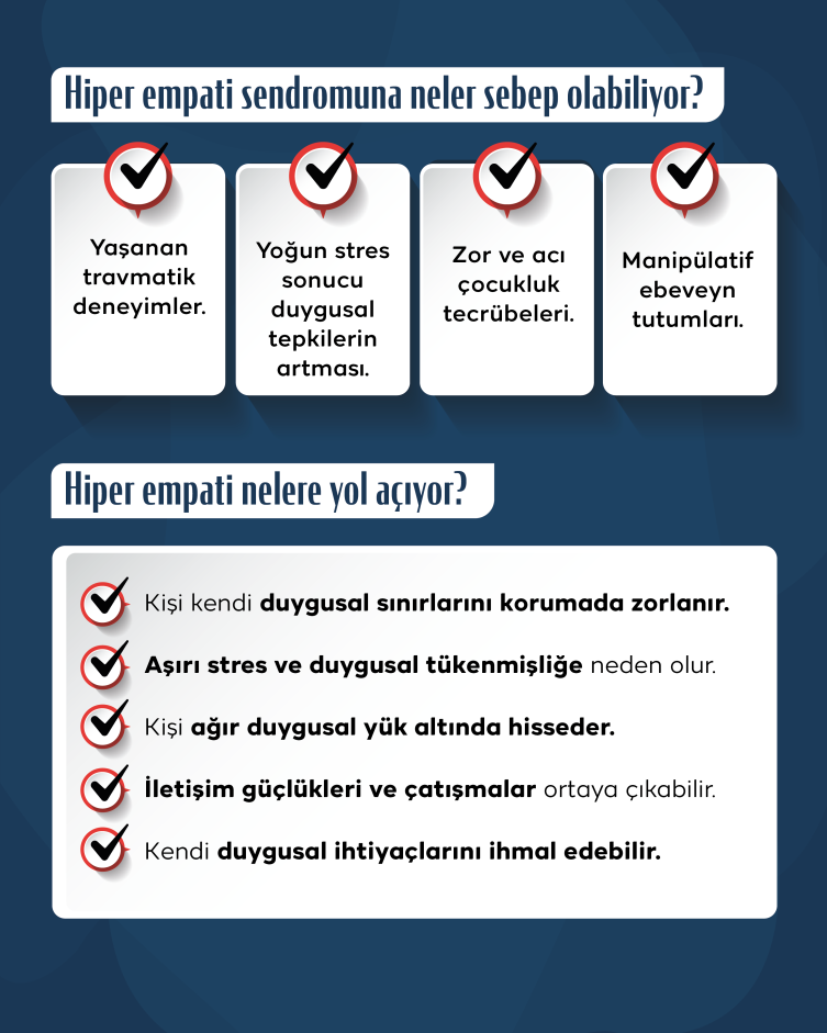 “Süreğen bir şekilde başkalarının duygusal sorunlarına odaklanmak ve bunları normalden daha güçlü bir şekilde hissettiğinizi fark etmek, etrafınızdakilerin sevinci, mutluluğu, acısı veya üzüntüsü karşısında aşırı duygusal tepkiler verme eğilimi göstermek belirtiler arasında. Ayrıca, çevrenizin duygusal deneyimleriyle kendi duygusal sınırlarınızı koruma konusunda zorlanıyorsanız, çevresel uyarıcılara, seslere veya diğer duyusal uyaranlara karşı aşırı derecede duyarlıysanız bunlar da birer belirti. Anlaşmazlıklardan, çatışma ve tartışmalardan aktif olarak kaçınmak da sayılabilir. Çevresel uyaranlara karşı bedensel ve duygusal hassasiyetiniz etkilenebiliyorsa, ötekine karşı bağımlılık hissetme hali varsa, hiper empati sendromu düşünülebilir.”