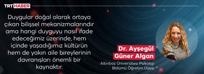 “Bireylerin duygularını nasıl ifade edeceklerini diğer insanları, özellikle de ebeveynlerini, gözlemleyerek geliştirdiklerini biliyoruz. Bu noktada çocukların çevrelerinde gözlemledikleri bu davranışı sıklıkla ortaya koyma ihtimalleri de artacaktır. Bu davranışlar büyüdükten sonra devam etmektedir. Duygular doğal olarak ortaya çıkan bilişsel mekanizmalarındır ama hangi duyguyu nasıl ifade edeceğimiz üzerinde hem içinde yaşadığımız kültürün hem de yakın aile bireylerinin davranışları önemli bir kaynaktır.”