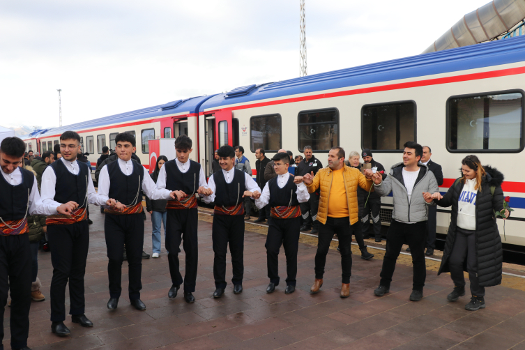 Yolculara, karşılama töreninin ardından tren garındaki stantlarda yöresel ürünlerden ikram edildi. Yolcular, halk oyunları gösterisini izledi, ekiple halay çekti.