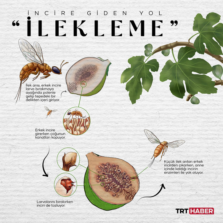 [Fotoğraf: Nursel Cobuloğlu Çoban / TRT Haber]İlek arısı, incirin oluşmasını canı pahasına sağlıyor. İncire larva bırakmaya ayağında polenle gelip, tepedeki delikten kabuğu aşıp içeri giriyor. Girerken çoğunun kanatları kopuyor. Yani artık onlar için incirin içi son nokta. Larvalarını bırakırken inciri de tozluyor. Küçük ilek arıları incirden çıkarken anne, içinde kaldığı incirin enzimleriyle yok oluyor. Küçük ilek arıları ise dişi incir ağacında tozlanmayı sağlayıp lezzetli incirin oluşumu için gereken ortamı yaratıyor.