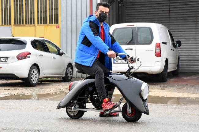Gövde kısmında, "vosvos" ve "kaplumbağa" olarak da anılan Volkswagen marka klasik otomobillerin çamurlukları kullanılan motosiklet, saatte 50 kilometre hıza ulaşabiliyor.