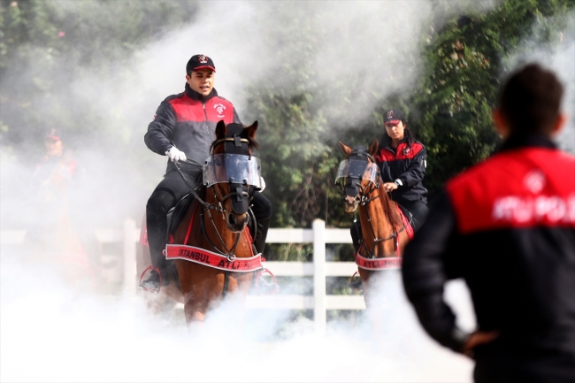 [Fotoğraf: AA]Yürüyüşle başlayıp dört nala koşuyla devam eden eğitimde atlar, önlerine sis bombası, torpil gibi malzemeler atılarak olaylara hazırlanıyor. Toplam 15 personel ve 8 attan oluşan Atlı Birlik Grup Amirliği, çalışmalarını düzenli olarak yaparak kendilerine verilecek görevi bekliyor.