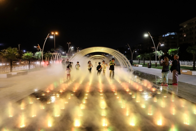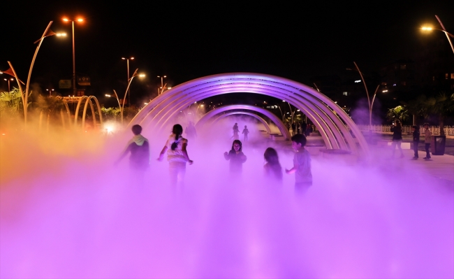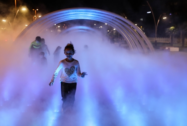Atomize su püskürtülmesiyle oluşan siste, özellikle çocuklar eğlenceli vakit geçiriyor.