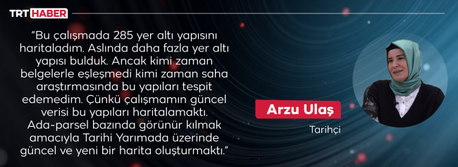“Bu çalışmada 285 yer altı yapısını haritaladım. Aslında daha fazla yer altı yapısı bulduk. Ancak kimi zaman belgelerle eşleşmedi kimi zaman saha araştırmasında bu yapıları tespit edemedim. Çünkü çalışmamın güncel verisi bu yapıları haritalamaktı. Ada-parsel bazında görünür kılmak amacıyla Tarihi Yarımada üzerinde güncel ve yeni bir harita oluşturmaktı.”