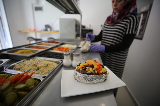 Fırından çıkan sıcak patatesleri uzunlamasına ikiye yaran ve içine kaşar peyniri koyarak karıştıran Hasini, daha sonra müşterinin damak tadına göre iç malzemeleriyle dolduruyor.